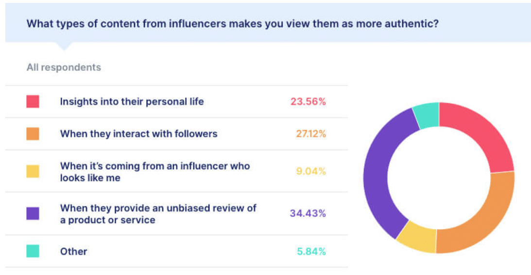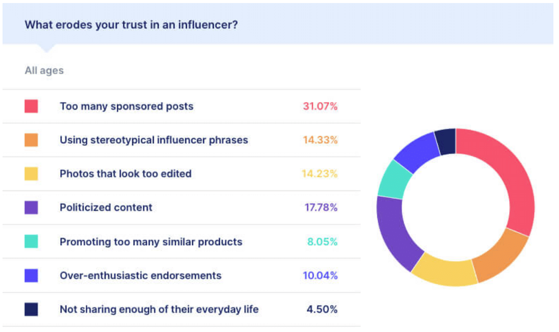 Of the Gen Z respondents, 31.69 percent named Instagram as the platform with the most genuine influencers, and 28.67 percent identified TikTok. Thirty-one percent of Boomers said Facebook. One-third of respondents said an excess of sponsored posts diminishes their trust in influencers.