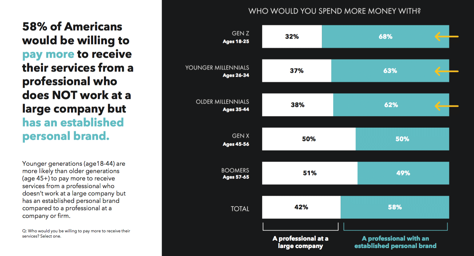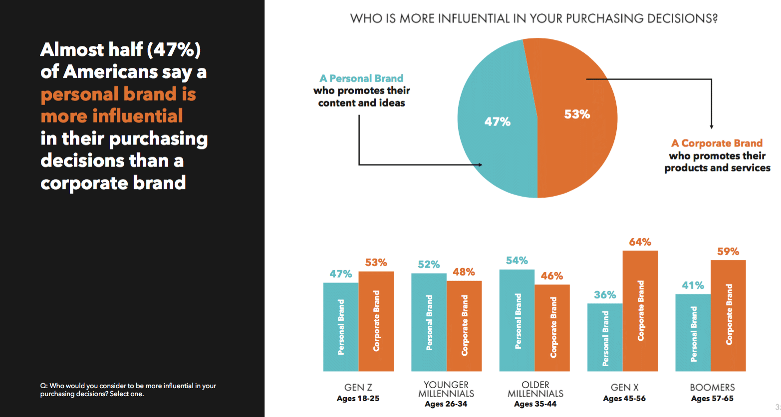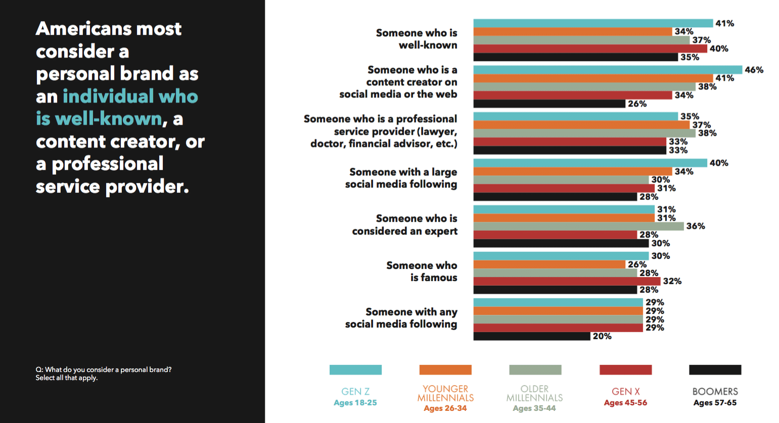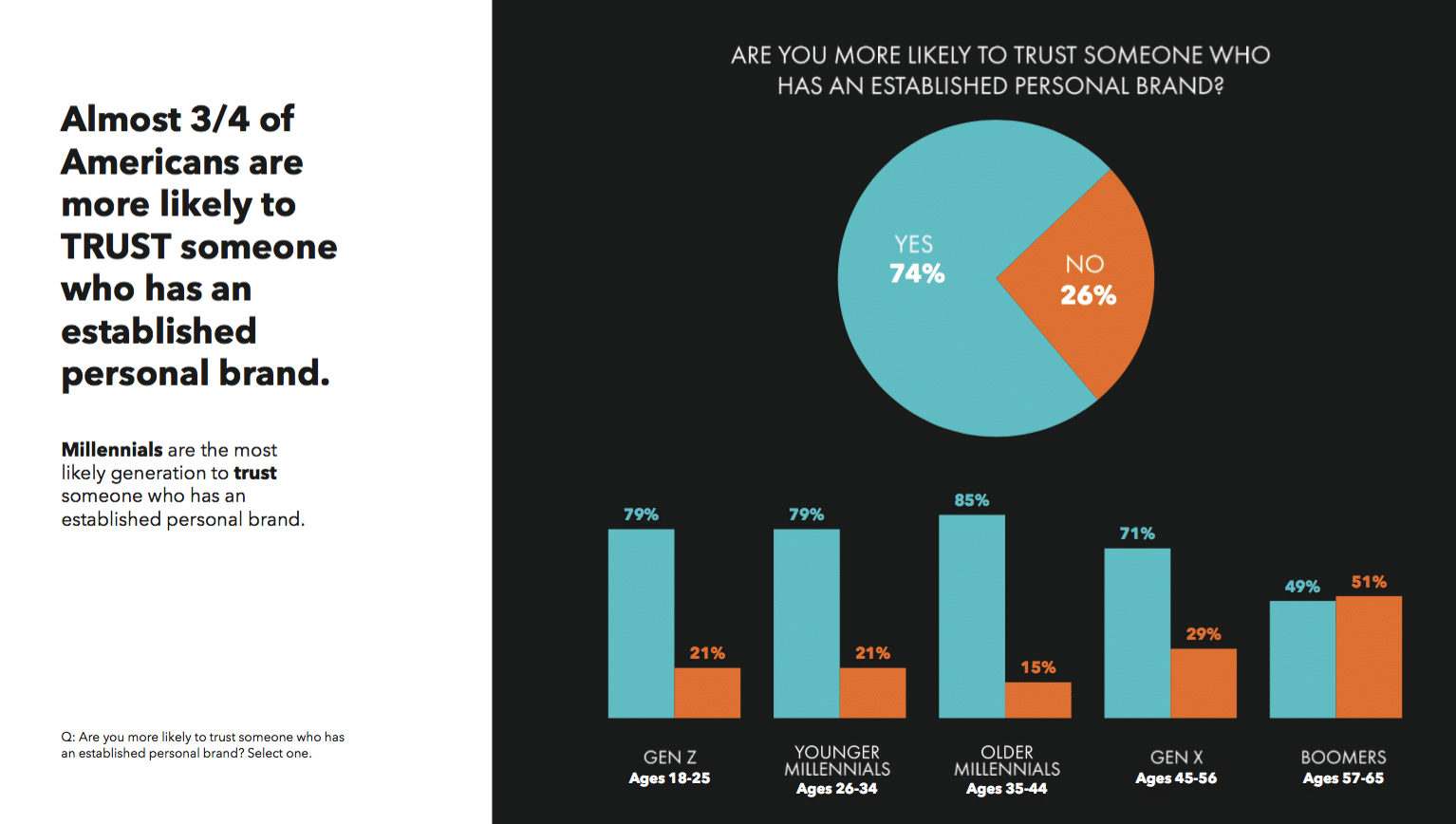Millennials and Gen Z place an (unexpectedly) high emphasis on personal branding in determining what they buy, where they work, who they listen to, who they recommend, who they hire, who they vote for and even who they date. Comparatively, 76 percent of Older Millennials (born 1977-1986) say they “are more likely to buy from someone who has an established personal brand,” while only 33 percent of Boomers responded the same way.