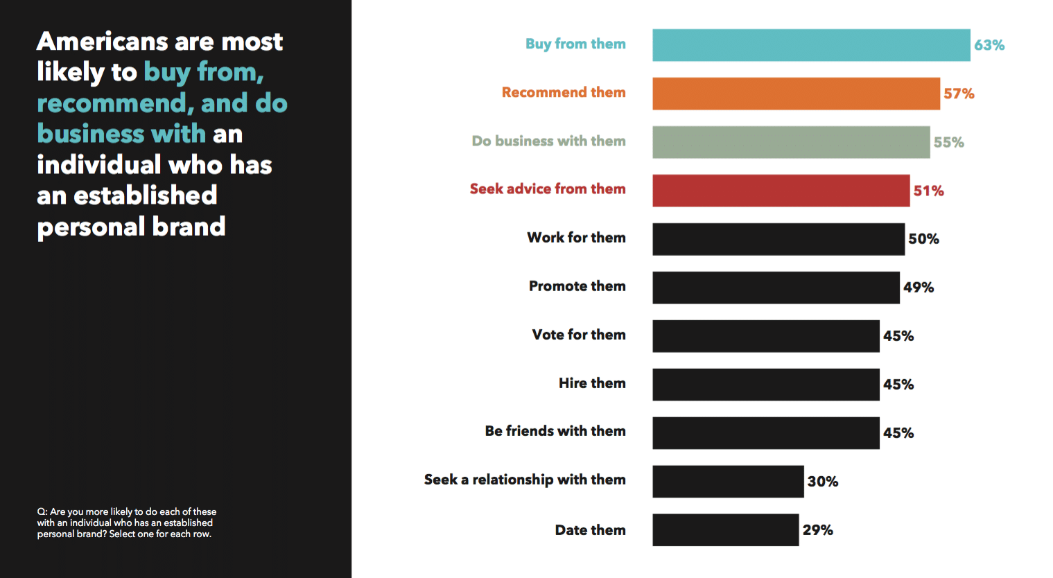 A striking 74 percent of all Americans reveal they “are more likely to trust someone who has an established personal brand.” In perhaps the most powerful statistic of the entire study, it turns out that 82 percent of all Americans agree that “companies are more influential if their executives have a personal brand that they know and follow.”