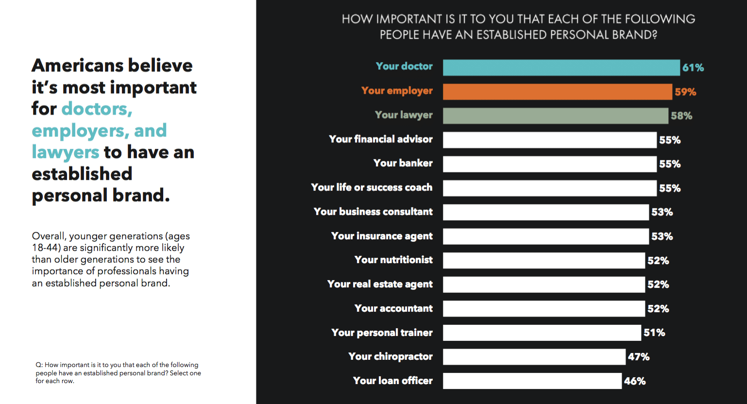 “The study confirmed some hypotheses we already had in place, but what we didn’t predict is that these impacts extend far beyond that of just ‘coaches and consultants’ or ‘online influencers,'” said AJ Vaden, CEO and co-founder of Brand Builders Group, in a news release. “It turns out that most Americans believe it’s important for their lawyer, financial advisor, banker, insurance agent, real estate agent and several other key professional service providers—including their doctor—to have an established personal brand.”