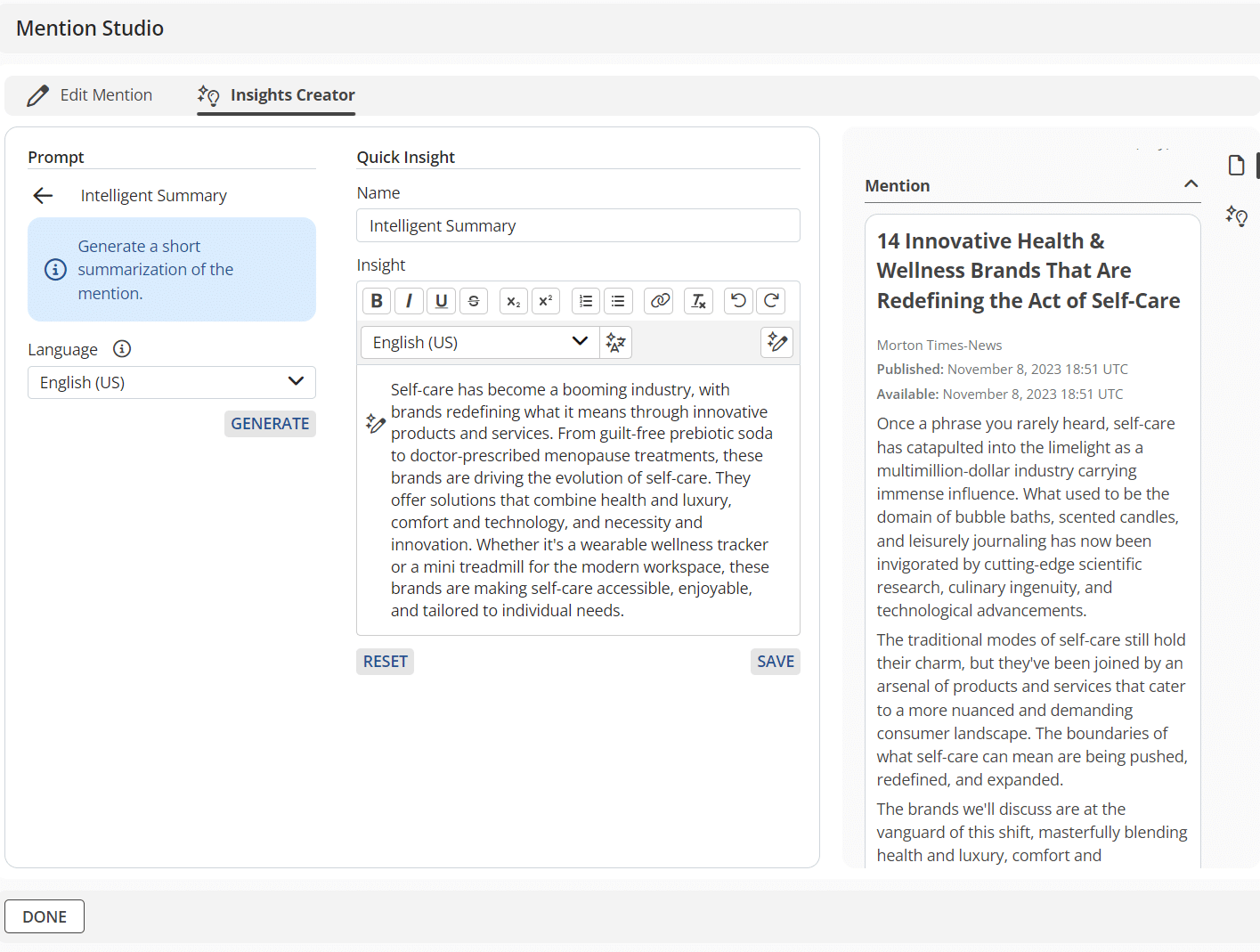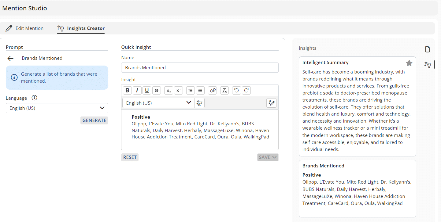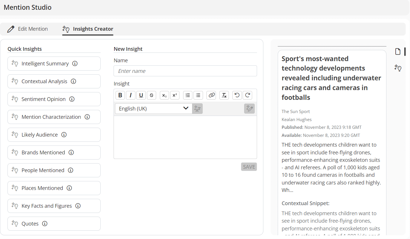 - On any media mention in Agility’s monitoring module, an Insights Creator has been added to the Mention Studio, offering 10 ways to apply insights to your media coverage.