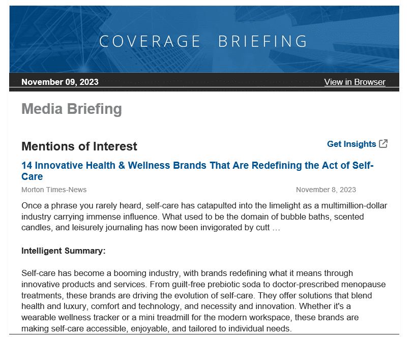 …and by including the option to ‘Get Insights’ you provide your briefing recipients with access to an interactive briefing, which allows them to switch between mentions and apply their own chosen insights to each one.