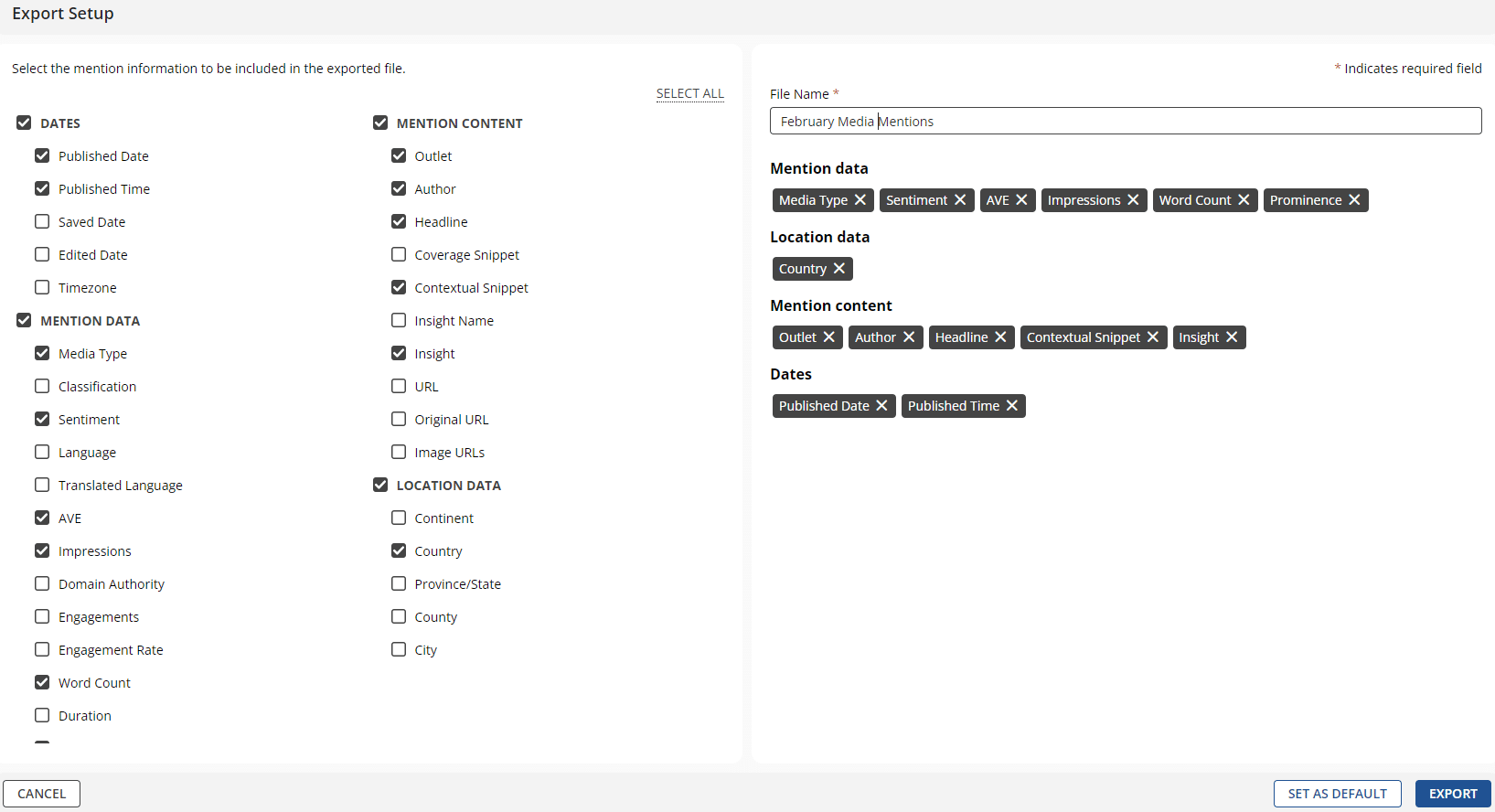 You can now save time by directly exporting media mentions without saving them, and improve efficiency by customizing the fields you want included with your mentions.
