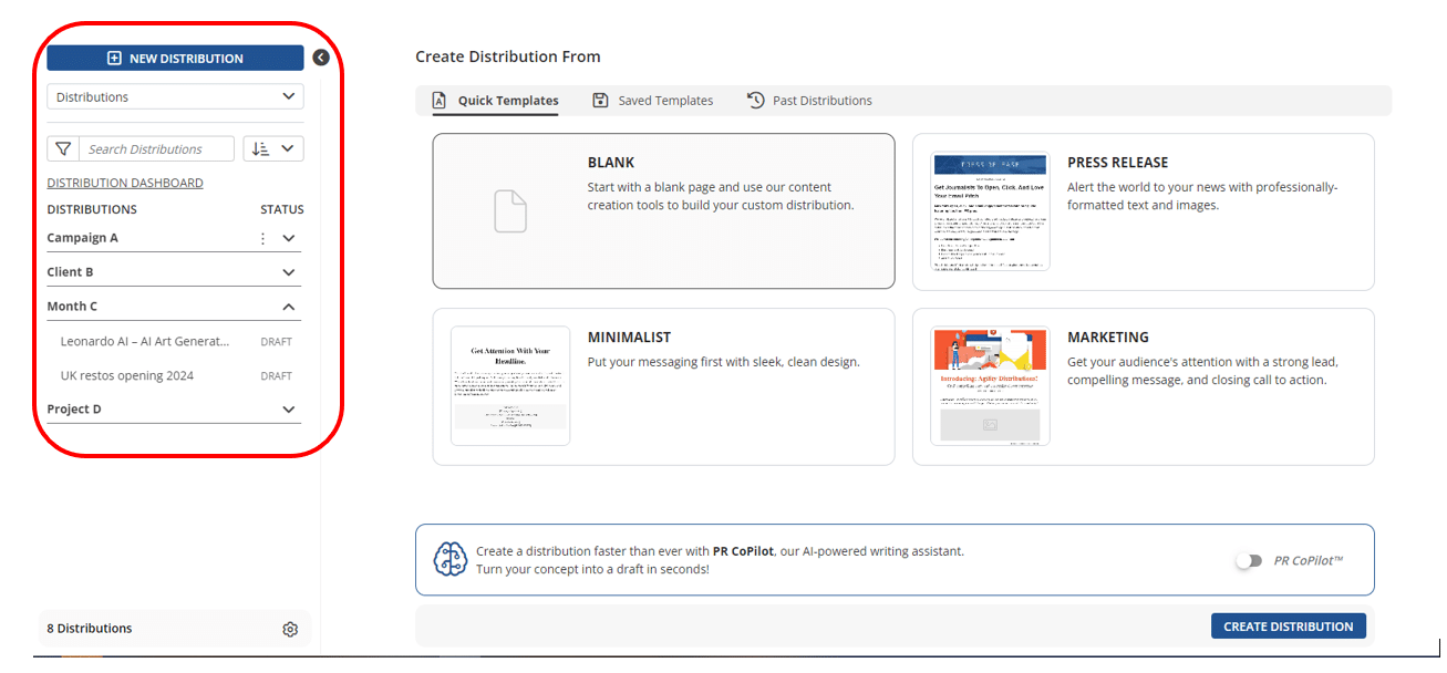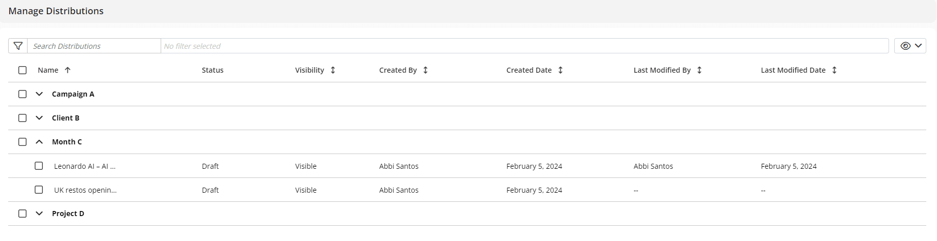 You can now group items in the left-hand panel for a smoother workflow. Creating groups enables you to organise your content, making it easier to identify and access – particularly if you have a large amount of work saved in Agility. In the example below, the user has organized their saved email distributions by four example criteria – Campaign, Client, Month, Project.