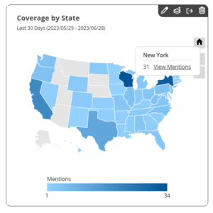 You can now design a geographic coverage chart to represent variations in the volume of mentions from country to country, state to state.