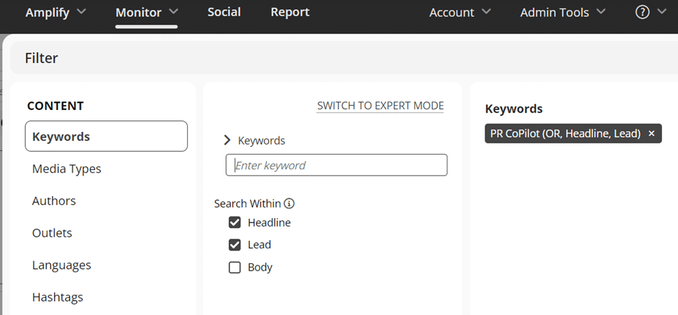 When filtering media mentions by keywords, you can now specify where within the articles the keywords should be. So if you want to isolate media mentions which feature a specific keyword within the headline, lead paragraph or main body, you can!