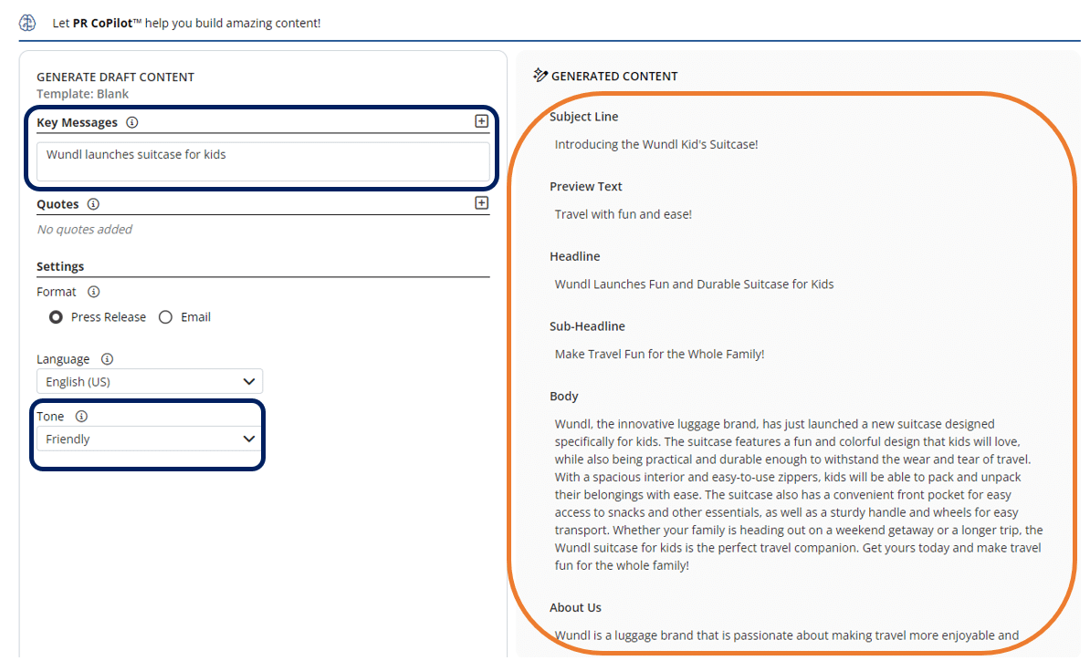 Based on a brief key message and a choice of tone, PR CoPilot will generate all the content for your email components…