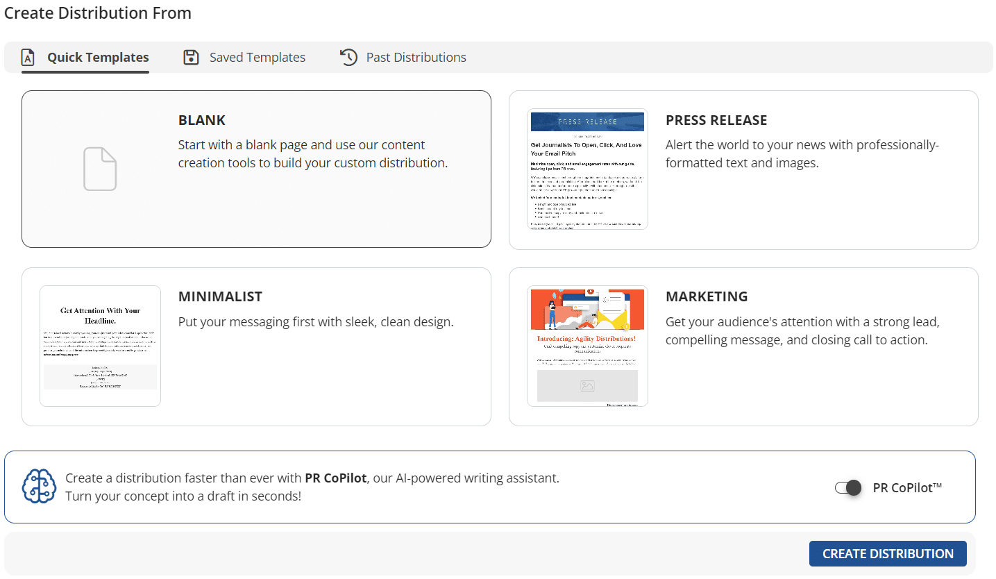 Simply select a template, toggle PR CoPilot on and click ‘Create Distribution’.