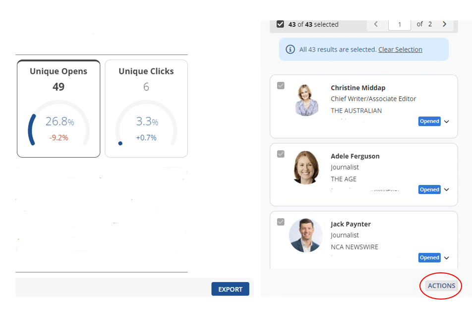 Agility’s email distribution reports now allow you to add batches of contacts directly to new or draft emails. So you can identify journalists that have opened your email and target them with a follow-up pitch very smoothly and quickly.