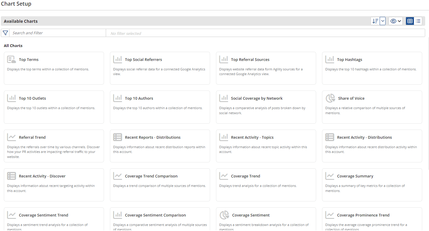 Within the dashboard, simply click ‘Add Chart’ from the bottom left-hand of your screen, and you are presented with the selection that is appropriate to your Agility service (Outreach, Monitoring, or both).
