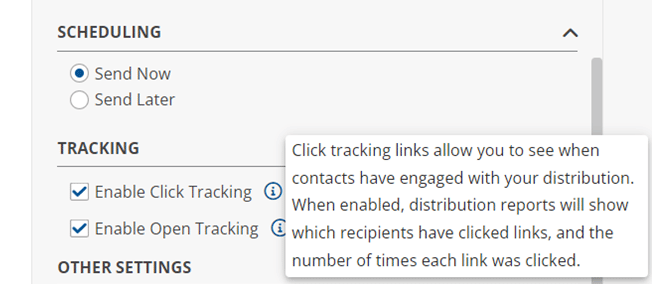 If you prefer to track and measure link clicks and email opens yourself, or simply not to collect that information from your audience at all, you can now switch off click tracking and open tracking within Agility. Click and Open Tracking will be enabled by default, and if you switch either off you must be aware that you won’t see these metrics in your distribution report.