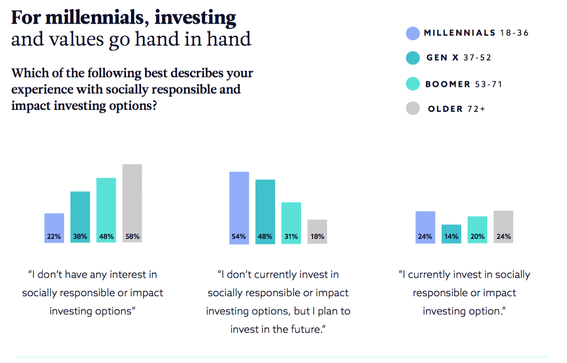 While intention around investing in socially responsible and impact investing options is high among younger investors, many have not yet taken action. More than half (54 percent) of millennial investors say they aren’t currently investing in socially responsible and impact investment options but plan to in the future.