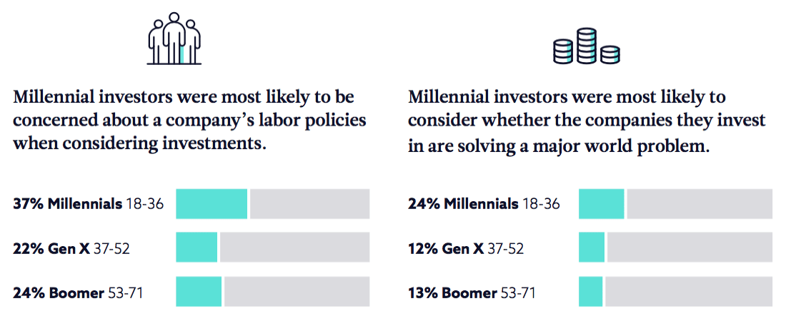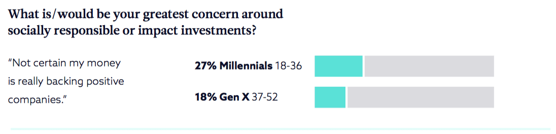 The firm’s new Money Meets Morals Study, conducted online by Harris Poll, found that nearly half (49 percent) of millennials who have investments aren’t able to name the top three companies in their investment portfolios. Millennial investors were also more likely than Gen X (aged 37-52) investors to be skeptical of socially responsible and impact investments with 27 percent saying that they were concerned that their money isn’t really backing positive companies when investing, compared to only 18 percent of Gen X investors.