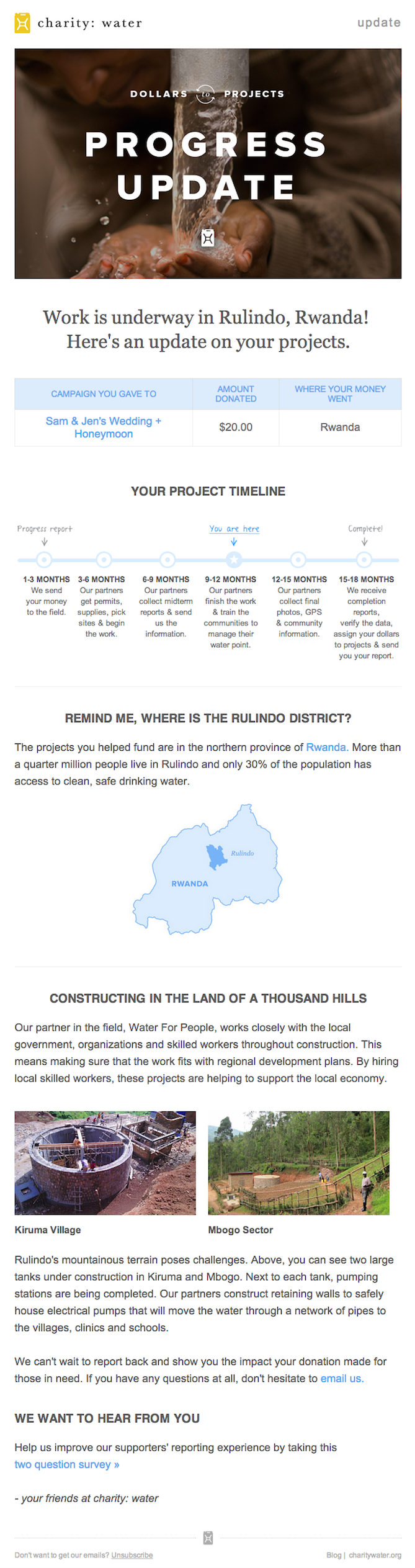 Charity: water, for instance, knows how exactly to use email marketing to keep people engaged. By providing updates on projects to people who donate, the organization makes its audience feel fully involved and included.