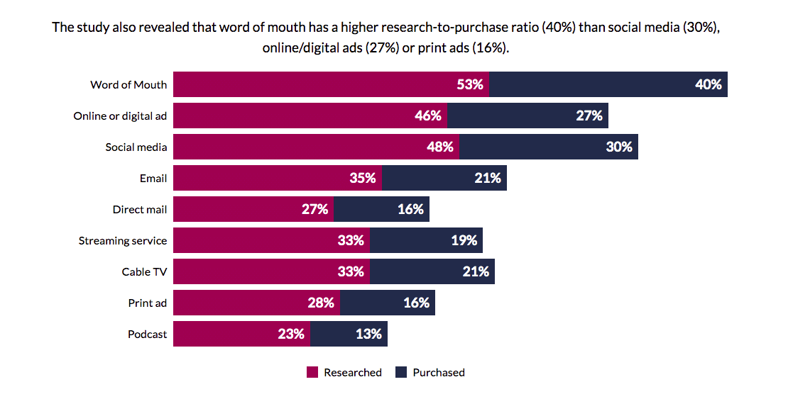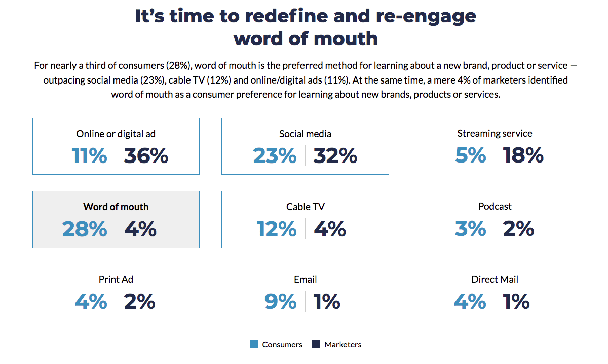 After a year of volatility and transformation, consumers value traditional marketing channels. For nearly a third of consumers (28 percent), word of mouth is the preferred method for learning about a new brand, product, or service—outpacing social media (23 percent), cable TV (12 percent) and online/digital ads (11 percent). At the same time, a mere 4 percent of marketers identified word of mouth as a consumer preference for learning about new brands, products, or services. The study also revealed that word of mouth has a higher research-to-purchase ratio (40 percent) than social media (30 percent), online/digital ads (27 percent), or print ads (16 percent).