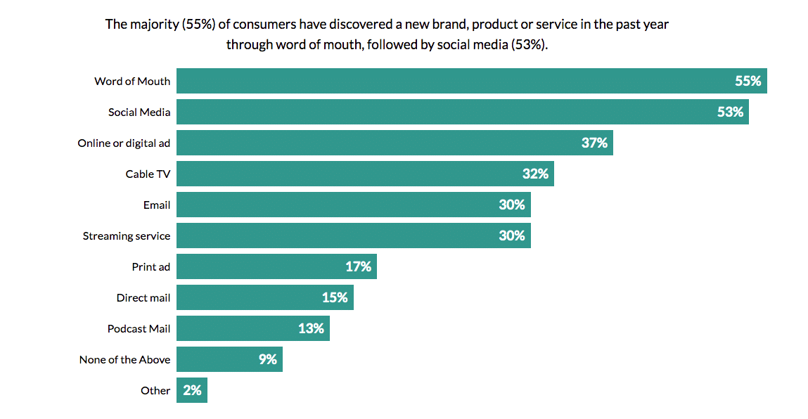 Word of mouth traditionally refers to consumers sharing product and brand recommendations with one another verbally. Today, this has evolved to include interactions between acquaintances on social media. Word of mouth outranked all other forms of brand discovery, with the survey findings showing that the majority (55 percent) of consumers have discovered a new brand, product, or service in the past year through word of mouth, followed by social media (53 percent). More importantly, 40 percent of consumers actually purchased a product after discovering it via word of mouth, topping all other channels. Yet only 7 percent of marketers identified word of mouth as a channel that results in consumer purchases. This division speaks to the continued importance of word of mouth and asks marketers to deliver timely and relevant messaging that gives consumers something to talk about, both in-person and online.