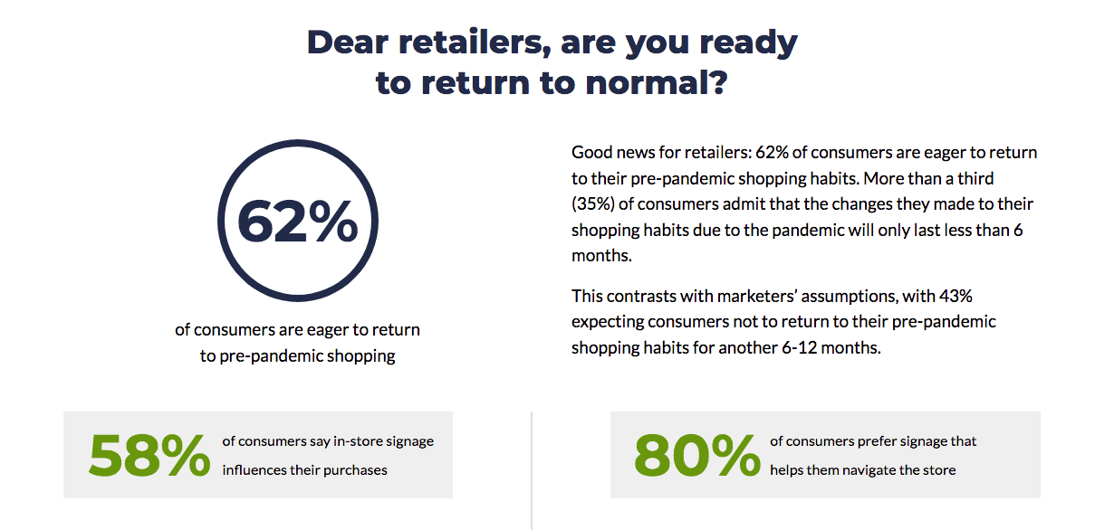 The good news for the retail sector is that 62 percent of consumers are eager to return to their pre-pandemic shopping habits. More than a third (35 percent) of consumers admit that the changes they made to their shopping habits due to the pandemic will only last less than 6 months. This contrasts with marketers’ assumptions, with 43 percent expecting consumers not to return to their pre-pandemic shopping habits for another 6-12 months. Consumers also show a preference for retailers who effectively use in-store signage and displays, with a majority (58 percent) saying that in-store signage is influential to their purchase decisions. Eight in 10 prefer to shop in stores with signage that helps them navigate the store and avoid crowds. These data points suggest that consumers are more eager to return to in-store shopping than many marketers assume and have high expectations, confirming the importance of experience-driven in-store marketing strategies.