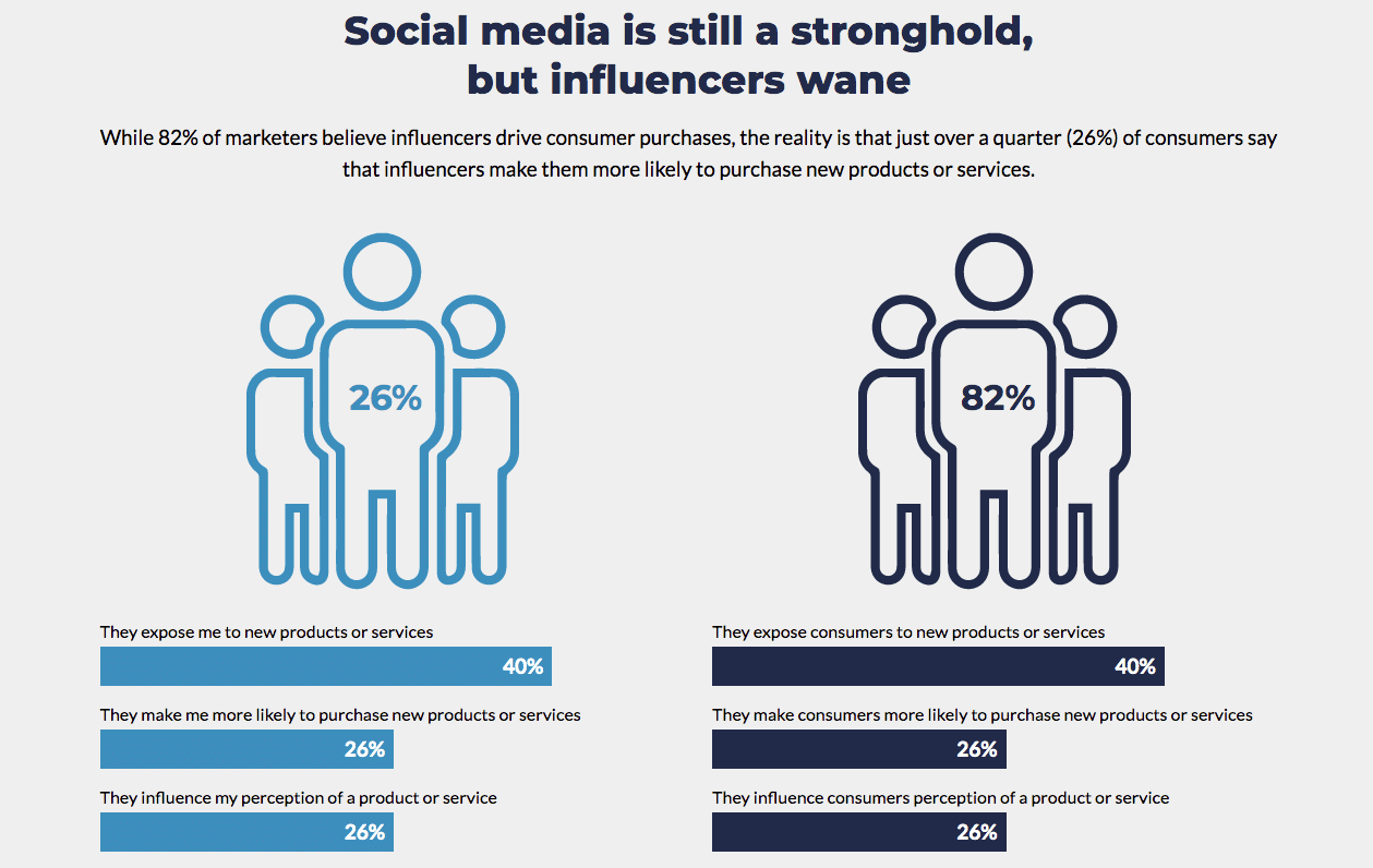 While consumers indicated their preference for some forms of traditional marketing channels, their engagement with brands online and via social media continues to evolve, posing additional complexities for marketers looking to connect with their audiences. While 82 percent of marketers believe influencers—public figures that promote brands, products, or services, often in social media—drive consumer purchases, the reality is that just over a quarter (26 percent) of consumers say that influencers make them more likely to purchase new products or services.
