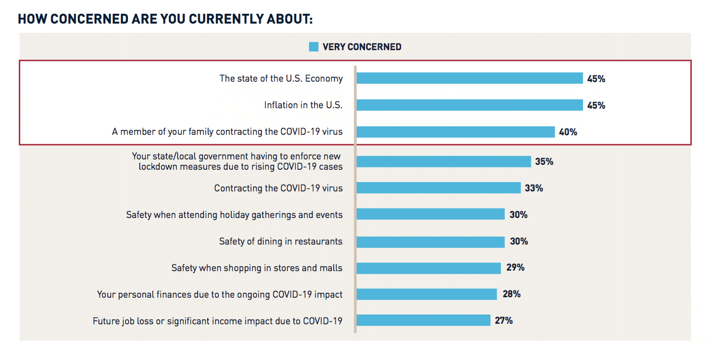 The research decisively found that inflation and reductions and eliminations of government assistance, such as renter’s protection, have begun to impact personal spending power. Of the respondents, 45 percent are very concerned about the state of the U.S. economy and inflation. Likewise, 40 percent of respondents are very concerned about a family member catching COVID, and 59 percent are very or somewhat concerned about COVID disrupting holiday celebration plans.