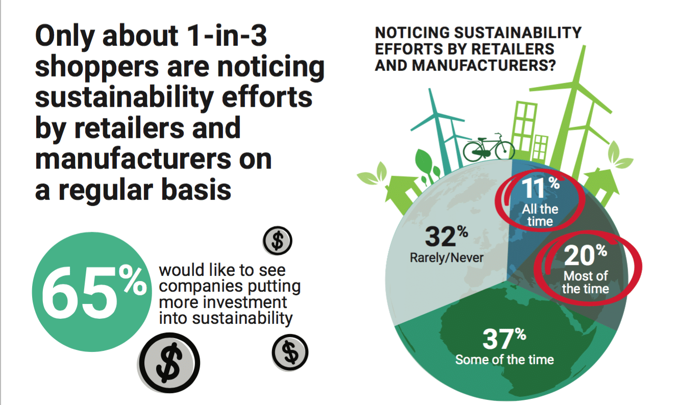 - Only about 1-in-3 shoppers are noticing sustainability efforts by retailers and manufacturers on a regular basis.