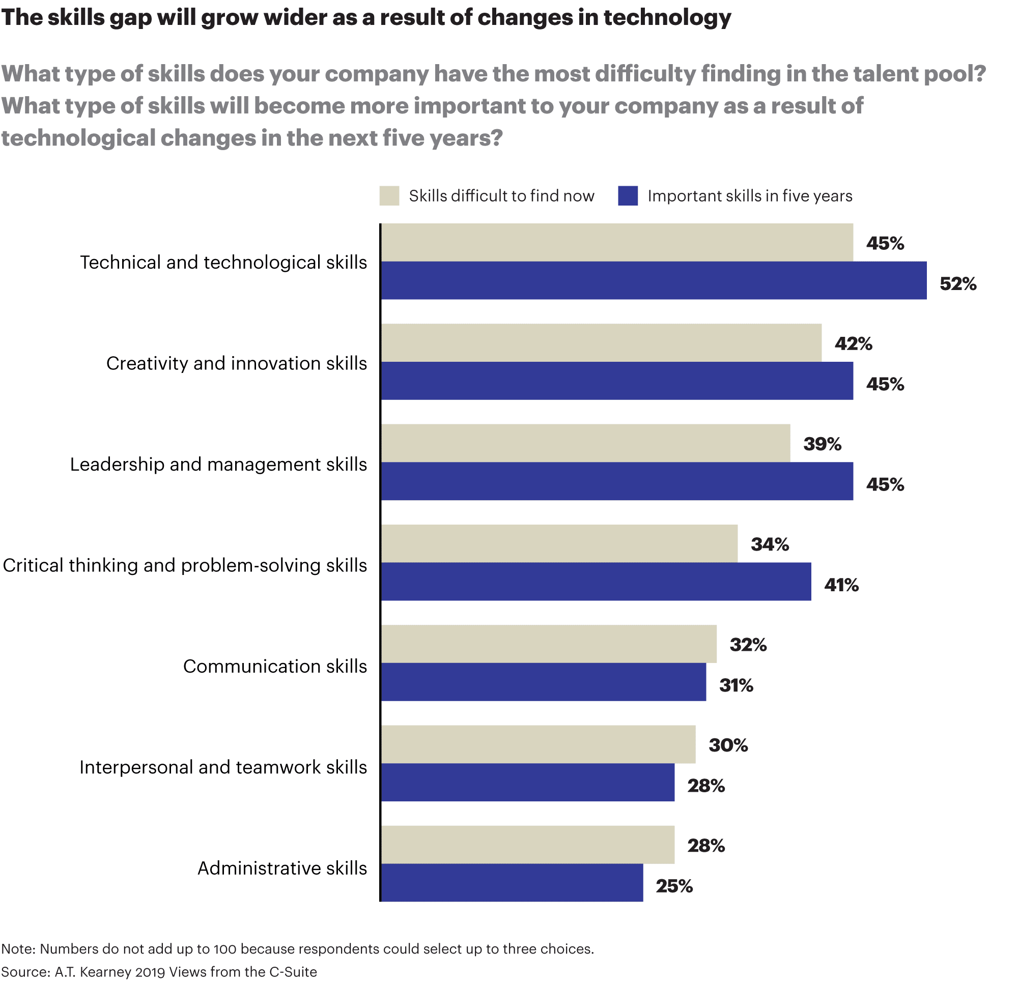 In an age of increasing automation and artificial intelligence, new research from management consulting firm A.T. Kearney finds that execs around the world foresee a rapidly evolving operating landscape in the year ahead. Even as technological advances saturate business and workplace practices, these execs are recognizing the differentiating role of non-technical and interpersonal skills such as creativity and leadership—skills that are not only difficult to find but also expected to become even more important.