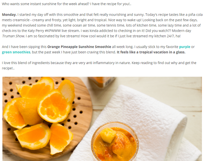 Kathy Patalsky’s blog is one of the best examples of how a personal touch can increase engagement with your target audience. Kathy shares vegan recipes, healthy habits, and lifestyle advice with her readers as if she is having a personal conversation with them.