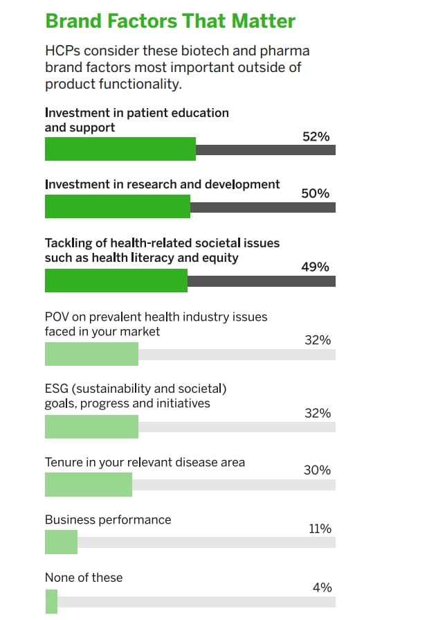 Nine out of 10 healthcare professionals surveyed say biotech and pharmaceutical companies should support improving patient health outcomes in ways beyond high-quality drug therapies. Seventy-three percent believe these companies should add value to society beyond providing their goods and services; for instance, offering medical education and patient support, as well as driving sustainability initiatives.
