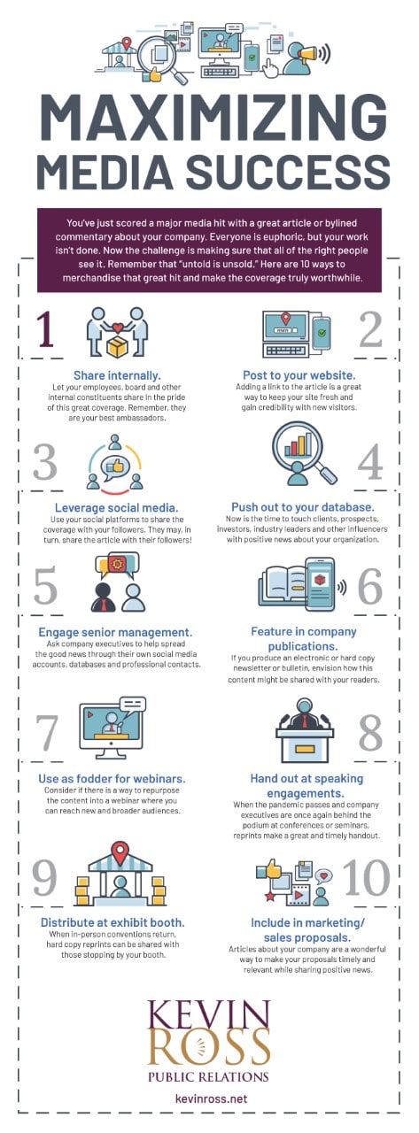 “Once upon a time, getting a great story placed in a respected outlet was enough to say, ‘job well done.’ But no more,” says Ross Goldberg, founder and president of Kevin/Ross Public Relations. “With so many news outlets available for the consumer to consume, and so much noise in the marketplace, landing the story is no reason for PR folks to consider their job finished and to admire themselves in the mirror. In truth, their work has just begun. The task now is being smart, strategic and shrewd in making sure that great media hits gets in front of the desired audiences so as to truly maximize their benefits.”